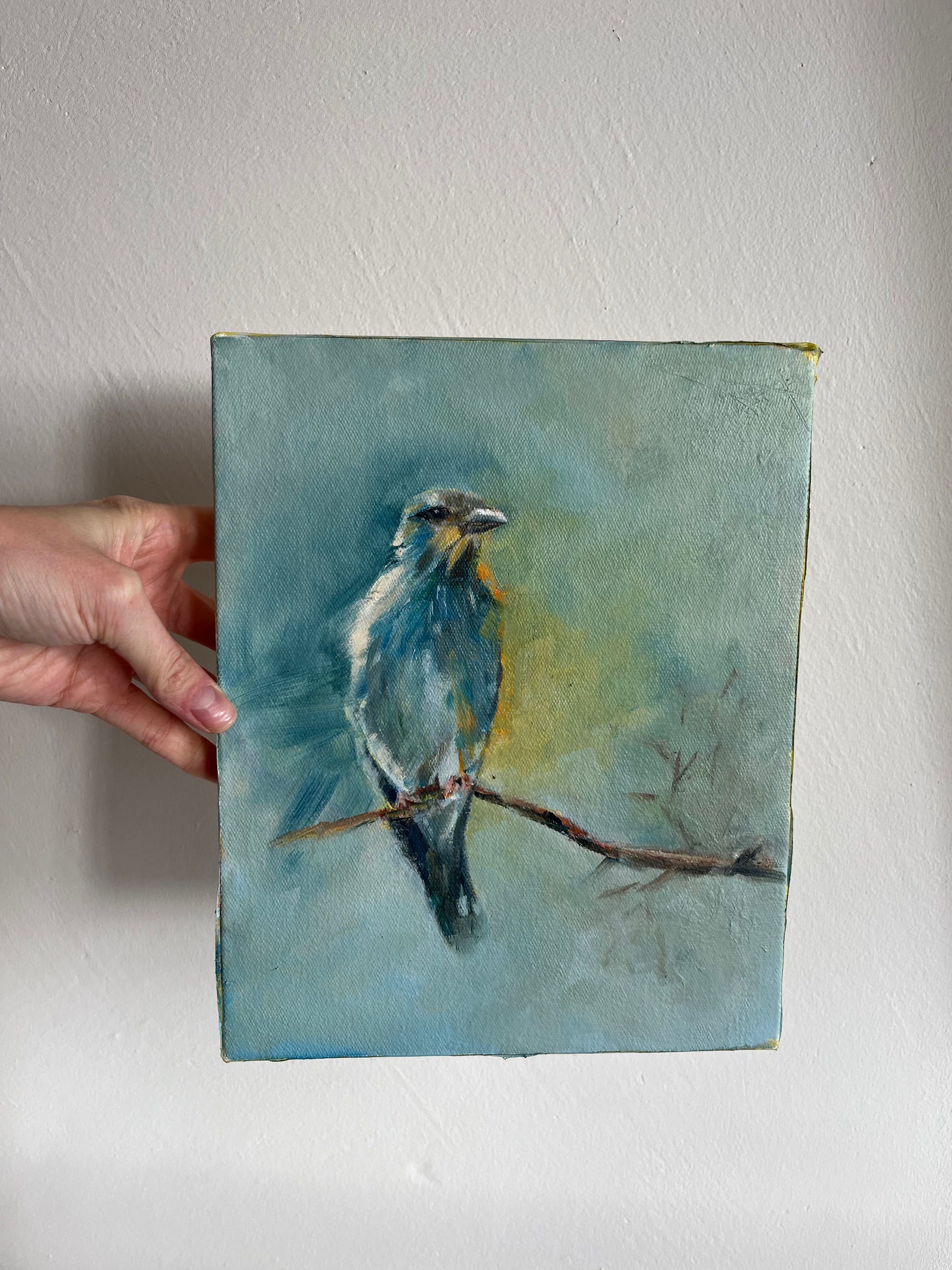 Transform any space with this beautiful 25x20cm oil on canvas painting of a small blue bird. Its sweet depiction is sure to brighten up any corner. Hand-painted by the talented Meryl, this piece is a perfect addition to your decor.